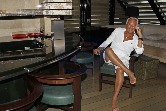 43216, IBIZA, SPAIN - Tuesday August 8 2010. **EXCLUSIVE PICTURES** EXCLUSIVE INTERVIEW AVAILABLE: Italian fashion legend Giorgio Armani shows off his new self-designed 65m superyacht called Main. The imposing yacht, which is currently moored in Ibiza, Spain, took 3 years to build. The famous stylist worked with designers and boat builders to create the exterior - he also created the interior by working alongside Studio Ortelli and it's trusted architects. **USA & CANADA USE ONLY** **FEE MUST BE AGREED PRIOR TO USAGE** **E-TABLET/IPAD & MOBILE PHONE APP PUBLISHING REQUIRES ADDITIONAL FEES**, Credit:SolarPix, PacificCoastNews.com / Avalon