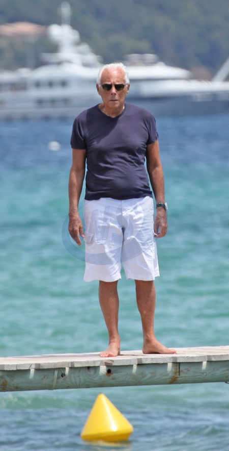 122655, Giorgio Armani seen on the dock of the club 55 accompanied by friends in Saint-Tropez. Saint-Tropez, France - Sunday July 13, 2014. USA ONLY, Credit:PacificCoastNews / Avalon