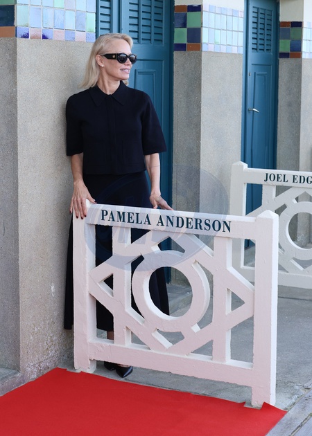 Pamela Anderson inaugure sa cabine sur les planches de Deauville lors du 51éme Festival du Cinema Américain de Deauville le 5 Septembre 2025. © Denis Guignebourg/Bestimage Pamela Anderson inaugurates her cabin on the Deauville stage during the 51st Deauville American Film Festival on September 5, 2025.