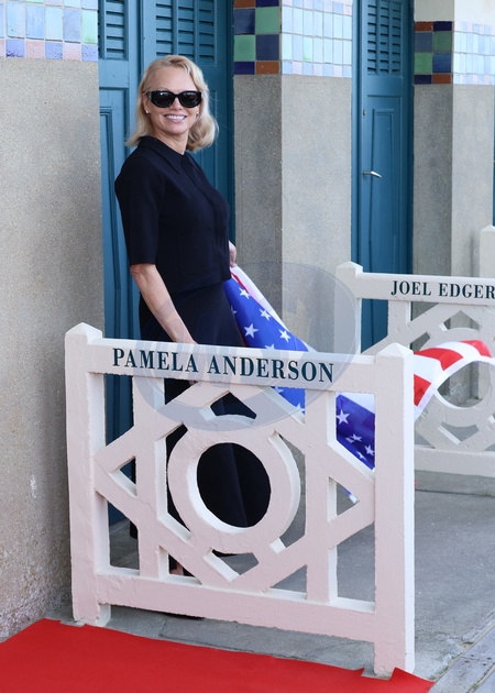 Pamela Anderson inaugure sa cabine sur les planches de Deauville lors du 51éme Festival du Cinema Américain de Deauville le 5 Septembre 2025. © Denis Guignebourg/Bestimage Pamela Anderson inaugurates her cabin on the Deauville stage during the 51st Deauville American Film Festival on September 5, 2025.