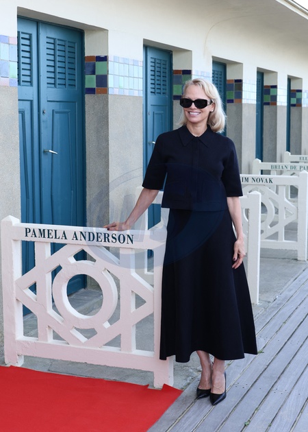 Pamela Anderson inaugure sa cabine sur les planches de Deauville lors du 51éme Festival du Cinema Américain de Deauville le 5 Septembre 2025. © Denis Guignebourg/Bestimage Pamela Anderson inaugurates her cabin on the Deauville stage during the 51st Deauville American Film Festival on September 5, 2025.