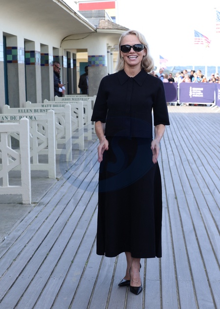 Pamela Anderson inaugure sa cabine sur les planches de Deauville lors du 51éme Festival du Cinema Américain de Deauville le 5 Septembre 2025. © Denis Guignebourg/Bestimage Pamela Anderson inaugurates her cabin on the Deauville stage during the 51st Deauville American Film Festival on September 5, 2025.