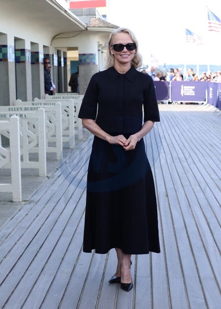 Pamela Anderson inaugure sa cabine sur les planches de Deauville lors du 51éme Festival du Cinema Américain de Deauville le 5 Septembre 2025. © Denis Guignebourg/Bestimage Pamela Anderson inaugurates her cabin on the Deauville stage during the 51st Deauville American Film Festival on September 5, 2025.