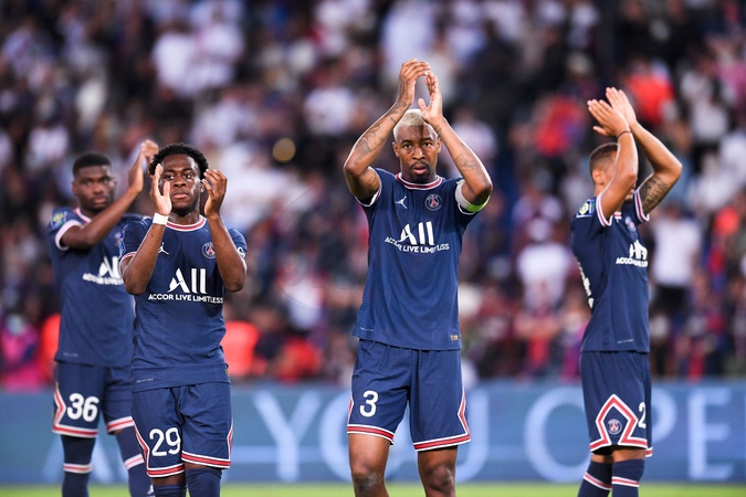Info - Presnel Kimpembe quitte le PSG pour le Qatar Sports Club JOIE - FAIR PLAY - 03 PRESNEL KIMPEMBE (PSG) - 29 ARNAUD KALIMUENDO (PSG) - Match de football en ligue 1 Uber Eats : Le PSG (Paris Saint-Germain) remporte la victoire 4-2 contre Strasbourg au Parc des Princes le 14 août 2021. Pas de jauge pour ce match, le Parc des Princes est rempli au maximum de sa capacité, une première depuis 18 mois. © Philippe Lecoeur / Panoramic / Bestimage Soccer match PSG vs Strasbourg (4-2) at Parc des Princes stadium in Paris on august 14th 2021