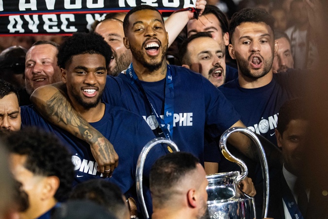 Les joueurs du PSG célèbrent leur titre de Champion d'Europe au Parc Des Princes à Paris