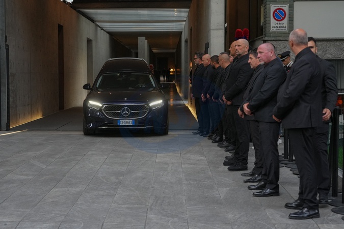 A hearse enters the Armani Theatre where late Italian fashion designer Giorgio Armani lay-in state for two days, on September 7, 2025. (Photo by Lucia Sabatelli / Bestimage) EDITORIAL USE ONLY