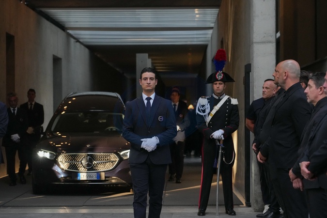 The hearse carrying the coffin of late Italian fashion designer Giorgio Armani leaves the Armani Theatre, in Milan on September 7, 2025. (Photo by Lucia Sabatelli / Bestimage) EDITORIAL USE ONLY