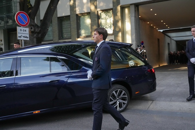 The hearse carrying the coffin of late Italian fashion designer Giorgio Armani leaves the Armani Theatre, in Milan on September 7, 2025. (Photo by Lucia Sabatelli / Bestimage) EDITORIAL USE ONLY