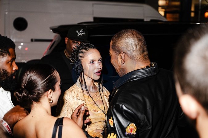 Les célébrités à la sortie de l'after party des "MTV Video Music Awards (VMA)" à New York, le 7 septembre 2025. © UrbanxDivinity / Bestimage Singer FKA Twigs and Rapper Busta Rhymes having a talk after leaving a VMAS afterparty lastnight in NYC. September 8th 2025