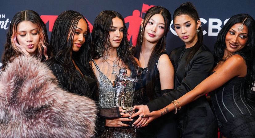 ELMONT, NASSAU COUNTY, NEW YORK, USA - SEPTEMBER 07: Megan Skiendiel, Manon Bannerman, Daniela Avanzini, Yoonchae Jeong, Sophia Laforteza and Lara Raj of KATSEYE pose in the press room at the 2025 MTV Video Music Awards held at UBS Arena on September 7, 2025 in Elmont, Nassau County, New York, United States., Credit:Jorge Estrellado / Avalon