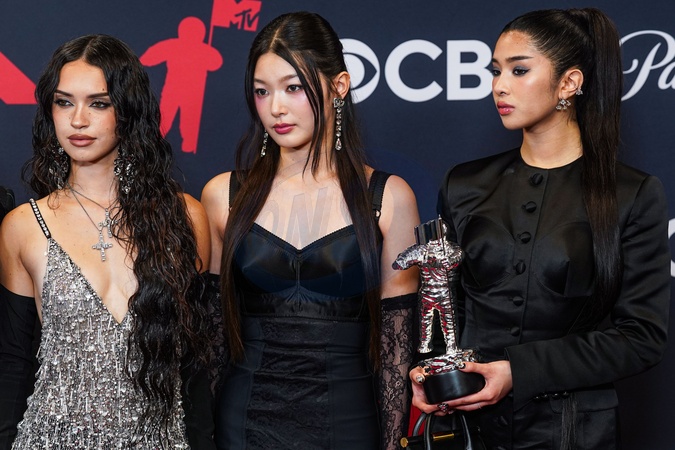 ELMONT, NASSAU COUNTY, NEW YORK, USA - SEPTEMBER 07: Daniela Avanzini, Yoonchae Jeong and Sophia Laforteza of KATSEYE pose in the press room at the 2025 MTV Video Music Awards held at UBS Arena on September 7, 2025 in Elmont, Nassau County, New York, United States., Credit:Jorge Estrellado / Avalon