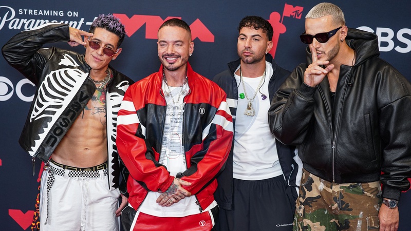 ELMONT, NASSAU COUNTY, NEW YORK, USA - SEPTEMBER 07: Lenny Tavarez, J Balvin, Justin Quiles and DJ Snake pose in the press room at the 2025 MTV Video Music Awards held at UBS Arena on September 7, 2025 in Elmont, Nassau County, New York, United States., Credit:Jorge Estrellado / Avalon