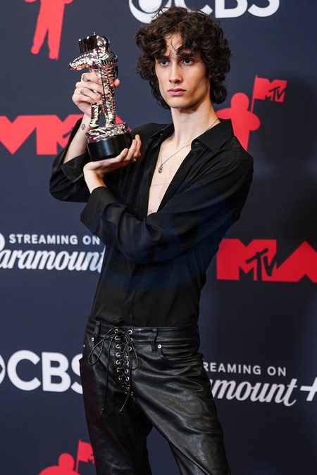 ELMONT, NASSAU COUNTY, NEW YORK, USA - SEPTEMBER 07: American singer, songwriter, and producer Sombr (Shane Michael Boose), winner of the 'Best Alternative' award for 'Back to Friends' wearing Valentino poses in the press room at the 2025 MTV Video Music Awards held at UBS Arena on September 7, 2025 in Elmont, Nassau County, New York, United States., Credit:Jorge Estrellado / Avalon