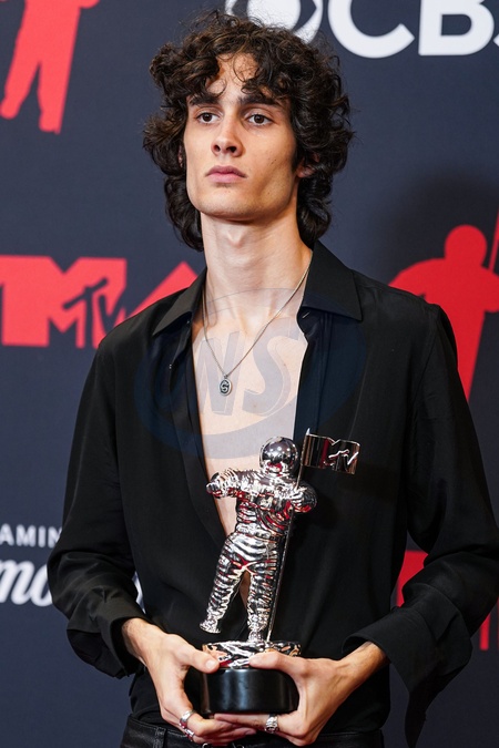 ELMONT, NASSAU COUNTY, NEW YORK, USA - SEPTEMBER 07: American singer, songwriter, and producer Sombr (Shane Michael Boose), winner of the 'Best Alternative' award for 'Back to Friends' wearing Valentino poses in the press room at the 2025 MTV Video Music Awards held at UBS Arena on September 7, 2025 in Elmont, Nassau County, New York, United States., Credit:Jorge Estrellado / Avalon
