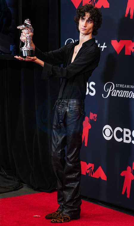 ELMONT, NASSAU COUNTY, NEW YORK, USA - SEPTEMBER 07: American singer, songwriter, and producer Sombr (Shane Michael Boose), winner of the 'Best Alternative' award for 'Back to Friends' wearing Valentino poses in the press room at the 2025 MTV Video Music Awards held at UBS Arena on September 7, 2025 in Elmont, Nassau County, New York, United States., Credit:Jorge Estrellado / Avalon