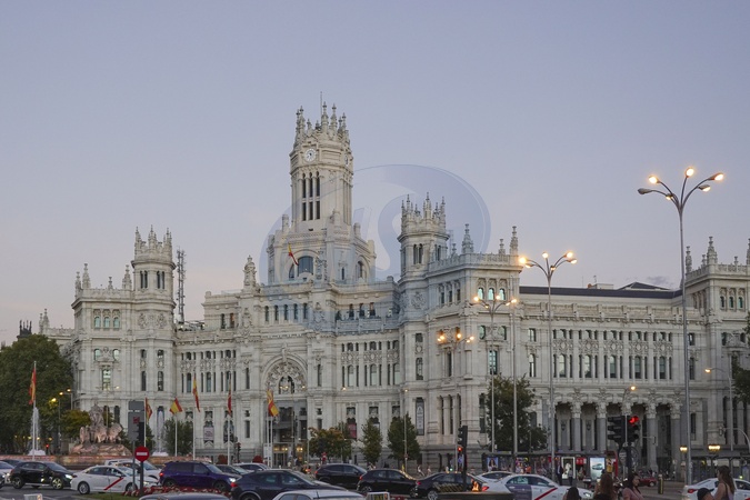 Spain, Madrid, Plaza de la Cibeles and Cibeles Palace, Palacio de Cibeles, formally known as Palacio de Comunicaciones today the City Hall of Madrid., Credit:Fabio Mazzarella / Avalon