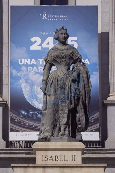 Spain, Madrid, The Teatro Real - Royal Opera of Madrid - is an opera house located at the Plaza de Oriente, opposite the Royal Palace, and known colloquially as El Real, it is considered the top institution of the performing and musical arts in the country and one of the most prestigious opera houses in Europe. Pictured: Statue of Queen Isabel II, Credit:Fabio Mazzarella / Avalon