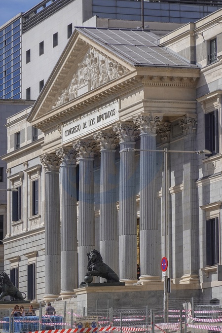 Spain, Madrid, Palacio de las Cortes is a building in Madrid where the Spanish Congress of Deputies meets. It is located on the Calle Zorrilla and the Carrera de San Jeronimo, near the Paseo del Prado. It was built by Narciso Pascual Colomer from 1843 to 1850, Credit:Fabio Mazzarella / Avalon