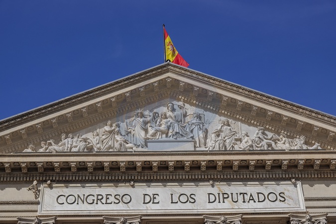 Spain, Madrid, Palacio de las Cortes is a building in Madrid where the Spanish Congress of Deputies meets. It is located on the Calle Zorrilla and the Carrera de San Jeronimo, near the Paseo del Prado. It was built by Narciso Pascual Colomer from 1843 to 1850, Credit:Fabio Mazzarella / Avalon