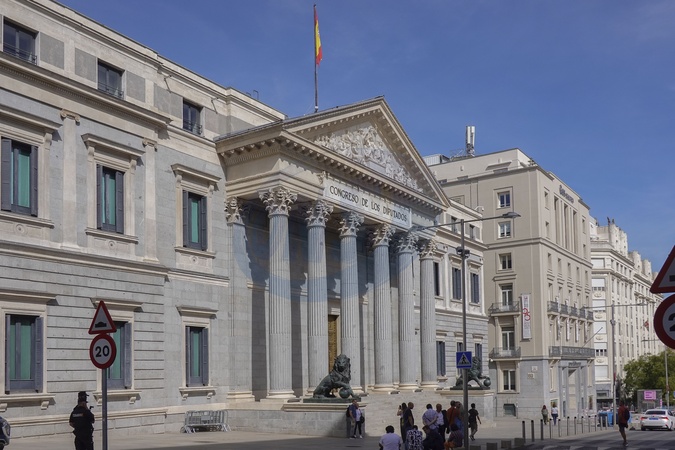 Spain, Madrid, Palacio de las Cortes is a building in Madrid where the Spanish Congress of Deputies meets. It is located on the Calle Zorrilla and the Carrera de San Jeronimo, near the Paseo del Prado. It was built by Narciso Pascual Colomer from 1843 to 1850, Credit:Fabio Mazzarella / Avalon