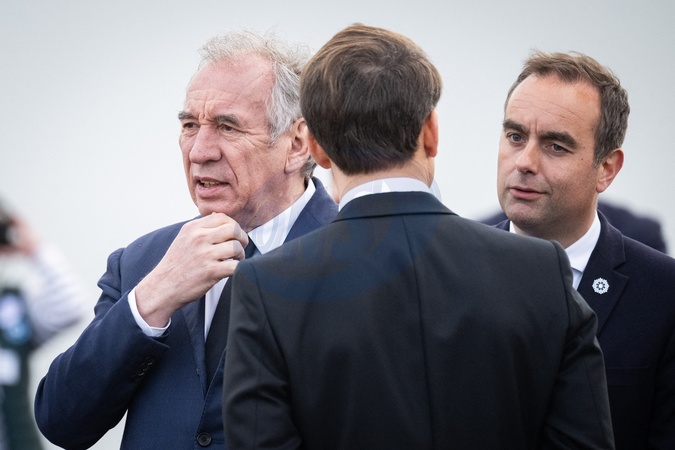 Info du 9 septembre 2025 ( Sebastien Lecornu nommé premier ministre) - Francois Bayrou, premier ministre, Emmanuel Macron, president de la Republique et Sebastien Lecornu, ministre des Armees, lors de la ceremonie du 80eme anniversaire de la victoire du 8 mai 1945, a l Arc de triomphe le 8 mai 2025. © Eric Tschaen/Poo/Bestimage. French President Emmanuel Macron attends ceremonies marking the 80th anniversary of Victory Day by the statue of General de Gaulle, in Paris, France, 08 May 2025.
