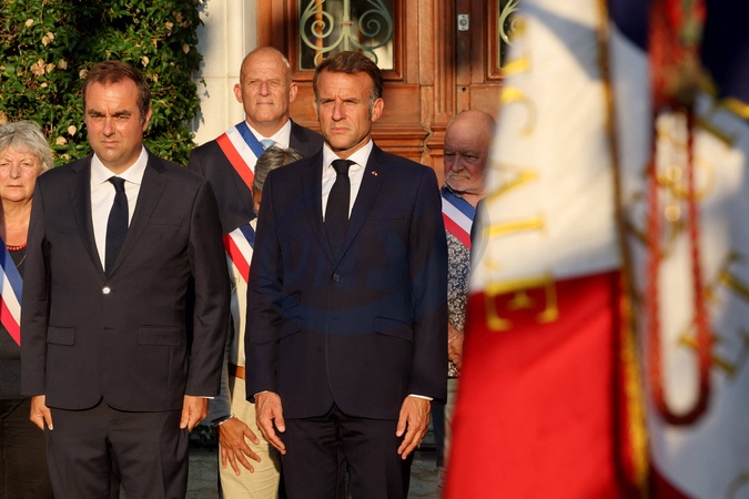 Info du 9 septembre 2025 ( Sebastien Lecornu nommé premier ministre) - Sebastien Lecornu, Emmanuel Macron. French Minister of Armed Forces Sebastien Lecornu, French President Emmanuel Macron stand at attention during a ceremony marking the 81st anniversary of the liberation of Bormes-les-Mimosas during World War II, Southern France, on August 17, 2025. Le ministre des Armees Sebastien Lecornu, le President Emmanuel Macron se tiennent au garde-a-vous lors d une ceremonie marquant le 81e anniversaire de la liberation de Bormes-les-Mimosas pendant la Seconde Guerre mondiale le dimanche 17 aout 2025. //ALAINROBERT_1Y8A8219/Credit:Alain ROBERT/SIPA/2508180756 © Alain Robert / Pool / Bestimage