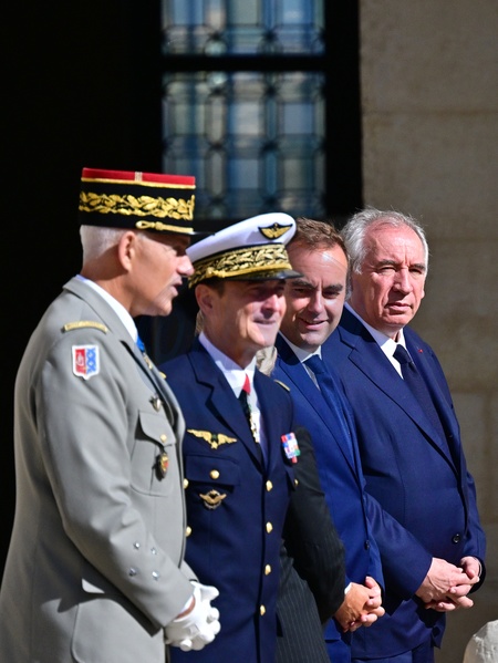 Sébastien Lecornu, Ministre des Armées, François Bayrou, Premier ministre - Cérémonie d'Adieu aux armes du général d'armée Thierry Burkhard, à l'Hôtel national des Invalides à Paris, le 5 septembre 2025. © Christian Liewig / Bestimage Farewell to Arms Ceremony for Army General Thierry Burkhard, at the Hôtel National des Invalides in Paris, September 5, 2025.