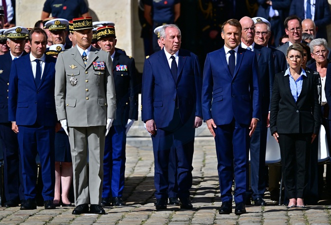 Sébastien Lecornu, Ministre des Armées, Thierry Burkhard, ancien chef d'état-major des armées françaises, François Bayrou, Premier ministre, Emmanuel Macron (président de la République Française), Patricia Mirallès, Ministre déléguée auprès du ministre des Armées, chargée de la Mémoire et des Anciens combattants, Éric Lombard, Ministre de l'Économie, des Finances et de la Souveraineté industrielle et numérique, Patricia Mirallès, Ministre déléguée auprès du ministre des Armées, chargée de la Mémoire et des Anciens combattants - Cérémonie d'Adieu aux armes du général d'armée Thierry Burkhard, à l'Hôtel national des Invalides à Paris, le 5 septembre 2025. © Christian Liewig / Bestimage Farewell to Arms Ceremony for Army General Thierry Burkhard, at the Hôtel National des Invalides in Paris, September 5, 2025.