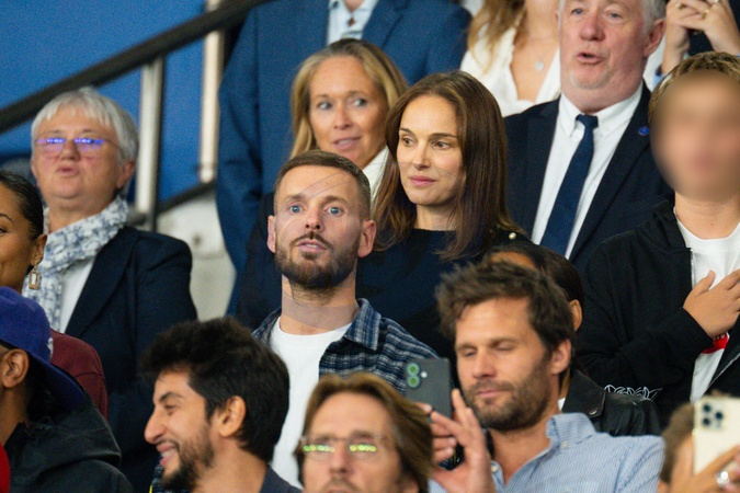 Natalie Portman et son fils Aleph, M. Pokora (Matt Pokora) - Célébrités dans les tribunes lors du match de qualification pour la Coupe du Monde 2026 entre la France et l'Islande (2-1) au Parc des Princes à Paris le 9 septembre 2025. ©Federico Pestellini/PsnewZ/Bestimage Celebrities in the stands during the 2026 World Cup qualifying match between France and Iceland (2-1) at the Parc des Princes in Paris on September 9, 2025.