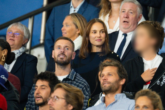 Natalie Portman et son fils Aleph, M. Pokora (Matt Pokora) - Célébrités dans les tribunes lors du match de qualification pour la Coupe du Monde 2026 entre la France et l'Islande (2-1) au Parc des Princes à Paris le 9 septembre 2025. ©Federico Pestellini/PsnewZ/Bestimage Celebrities in the stands during the 2026 World Cup qualifying match between France and Iceland (2-1) at the Parc des Princes in Paris on September 9, 2025.