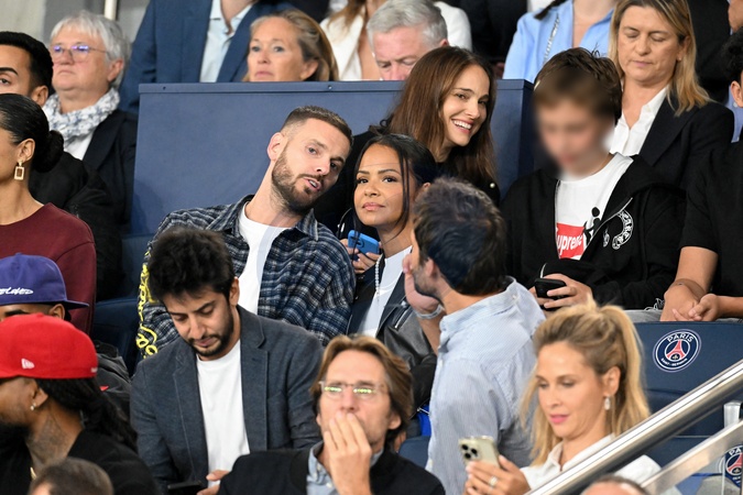 Natalie Portman et son fils Aleph, Christina Milian et son mari M. Pokora (Matt Pokora), Kamel Isker, Alexis Michalik - Célébrités dans les tribunes lors du match de qualification pour la Coupe du Monde 2026 entre la France et l'Islande (2-1) au Parc des Princes à Paris le 9 septembre 2025. © Lionel Urman/Bestimage Celebrities in the stands during the 2026 World Cup qualifying match between France and Iceland (2-1) at the Parc des Princes in Paris on September 9, 2025.