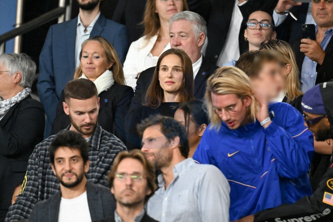 Natalie Portman et son fils Aleph, M. Pokora, Christina Milian, Mathieu Vergne, Ophelie Meunier, Kamel Isker, Alexis Michalik, Paul Mirabel - Célébrités dans les tribunes lors du match de qualification pour la Coupe du Monde 2026 entre la France et l'Islande (2-1) au Parc des Princes à Paris le 9 septembre 2025. © Lionel Urman/Bestimage Celebrities in the stands during the 2026 World Cup qualifying match between France and Iceland (2-1) at the Parc des Princes in Paris on September 9, 2025.