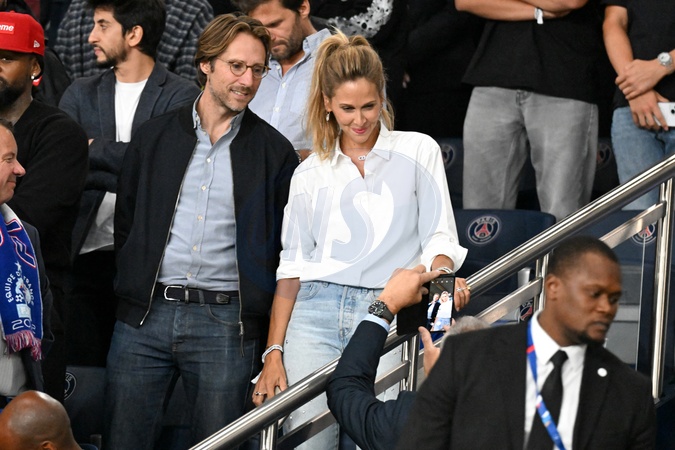 Mathieu Vergne et sa femme Ophélie Meunier - Célébrités dans les tribunes lors du match de qualification pour la Coupe du Monde 2026 entre la France et l'Islande (2-1) au Parc des Princes à Paris le 9 septembre 2025. © Lionel Urman/Bestimage Celebrities in the stands during the 2026 World Cup qualifying match between France and Iceland (2-1) at the Parc des Princes in Paris on September 9, 2025.