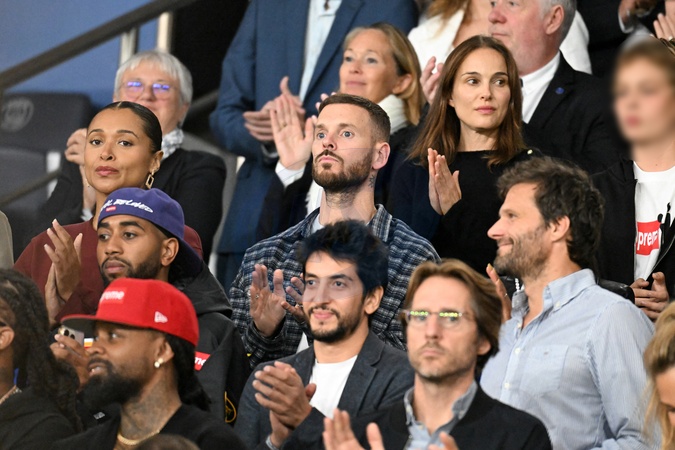 Natalie Portman et son fils Aleph, Christina Milian et son mari M. Pokora (Matt Pokora), Mathieu Vergn, Kamel Isker, Alexis Michalik - Célébrités dans les tribunes lors du match de qualification pour la Coupe du Monde 2026 entre la France et l'Islande (2-1) au Parc des Princes à Paris le 9 septembre 2025. © Lionel Urman/Bestimage Celebrities in the stands during the 2026 World Cup qualifying match between France and Iceland (2-1) at the Parc des Princes in Paris on September 9, 2025.