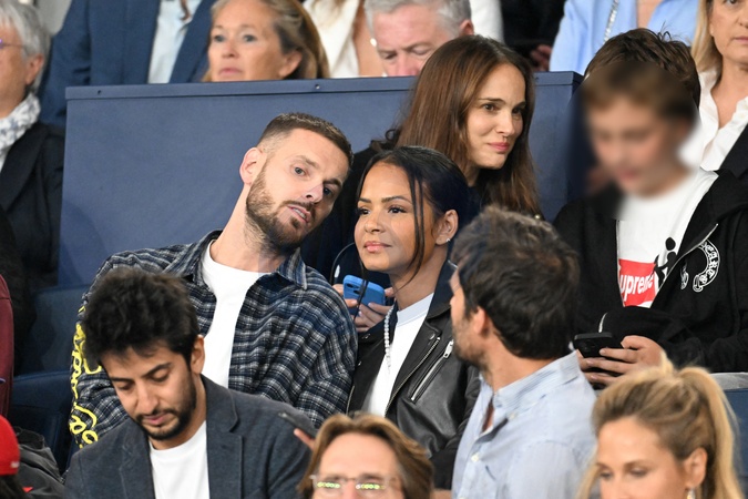 Natalie Portman et son fils Aleph, Christina Milian et son mari M. Pokora (Matt Pokora), Kamel Isker, Alexis Michalik - Célébrités dans les tribunes lors du match de qualification pour la Coupe du Monde 2026 entre la France et l'Islande (2-1) au Parc des Princes à Paris le 9 septembre 2025. © Lionel Urman/Bestimage Celebrities in the stands during the 2026 World Cup qualifying match between France and Iceland (2-1) at the Parc des Princes in Paris on September 9, 2025.