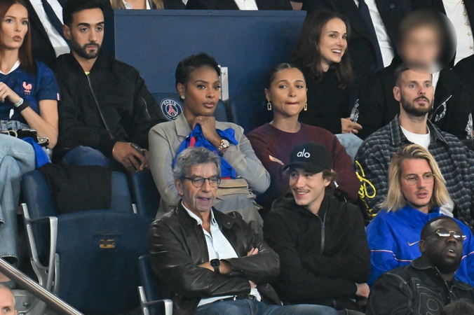 Natalie Portman et son fils Aleph, Angélique Angarni-Filopon (Miss France 2025), Pokora (Matt Pokora), Michel Cymes, Paul Mirabel - Célébrités dans les tribunes lors du match de qualification pour la Coupe du Monde 2026 entre la France et l'Islande (2-1) au Parc des Princes à Paris le 9 septembre 2025. © Lionel Urman/Bestimage Celebrities in the stands during the 2026 World Cup qualifying match between France and Iceland (2-1) at the Parc des Princes in Paris on September 9, 2025.
