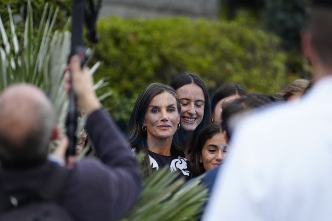 Królowa Letizia przy wyjściu z konferencji „Kobiety, sport i społeczeństwo” zorganizowanej w Casa de la Cultura „Paco de Lucía” w Torrelodones