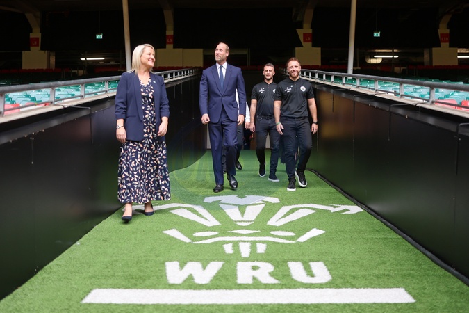 CARDIFF, WALES - SEPTEMBER 10: Prince William, Prince of Wales talks to Elizabeth Thomas-Evans (L), CEO Jac Lewis Foundation, Jesse Lewis (3rd L), Jac Lewis' father, and teammates from Jac's football team Ammanford FC during his visit to new a mental health hub run by the Jac Lewis Foundation on World Suicide Prevention Day at Principality Stadium on September 10, 2025 in Cardiff, Wales., Credit:Chris Jackson / Avalon