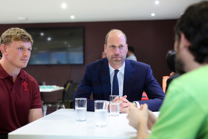 CARDIFF, WALES - SEPTEMBER 10: Prince William, Prince of Wales talks to Jac Morgan (L) and other members of the Welsh Rugby Union during his visit to new a mental health hub run by the Jac Lewis Foundation on World Suicide Prevention Day at Principality Stadium on September 10, 2025 in Cardiff, Wales., Credit:Chris Jackson / Avalon