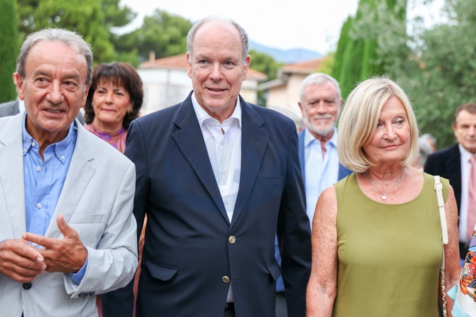 Exclusif - No Tabloïds - Le prince Albert II de Monaco, Patrick Cesari, maire de Roquebrune-Cap-Martin et sa femme Martine lors de la 14ème édition des Journées de l'Art-Bre (hommage à la championne olympique de voile Virginie Hériot) au parc du Cap Martin à Roquebrune-Cap-Martin, France, le 9 septembre 2025. © Claudia Albuquerque/Bestimage No Tabloïds - No Mail Online - Only for OK, Hello, Grazia in UK - 14th edition of the Journées de l'Art-Bre (tribute to Olympic sailing champion Virginie Hériot) at the Cap Martin park in Roquebrune-Cap-Martin, France, on September 9, 2025.