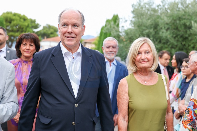 Exclusif - No Tabloïds - Le prince Albert II de Monaco et la femme du maire Martine Cesari lors de la 14ème édition des Journées de l'Art-Bre (hommage à la championne olympique de voile Virginie Hériot) au parc du Cap Martin à Roquebrune-Cap-Martin, France, le 9 septembre 2025. © Claudia Albuquerque/Bestimage No Tabloïds - No Mail Online - Only for OK, Hello, Grazia in UK - 14th edition of the Journées de l'Art-Bre (tribute to Olympic sailing champion Virginie Hériot) at the Cap Martin park in Roquebrune-Cap-Martin, France, on September 9, 2025.
