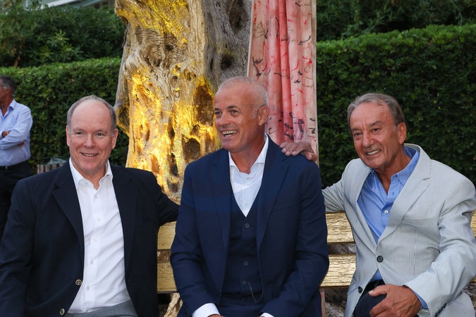 Exclusif - No Tabloïds - Le prince Albert II de Monaco, l'artiste Elend Zyma et Patrick Cesari, maire de Roquebrune-Cap-Martin lors de la 14ème édition des Journées de l'Art-Bre (hommage à la championne olympique de voile Virginie Hériot) au parc du Cap Martin à Roquebrune-Cap-Martin, France, le 9 septembre 2025. © Claudia Albuquerque/Bestimage No Tabloïds - No Mail Online - Only for OK, Hello, Grazia in UK - 14th edition of the Journées de l'Art-Bre (tribute to Olympic sailing champion Virginie Hériot) at the Cap Martin park in Roquebrune-Cap-Martin, France, on September 9, 2025.