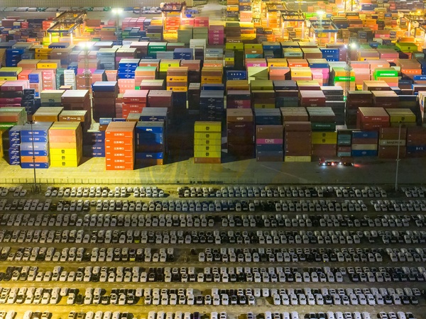 Aerial view of new cars waiting for shipment to overseas markets in a port in Nanjing in east China's Jiangsu province Sunday, Sept. 07, 2025., Credit:stringer / Avalon