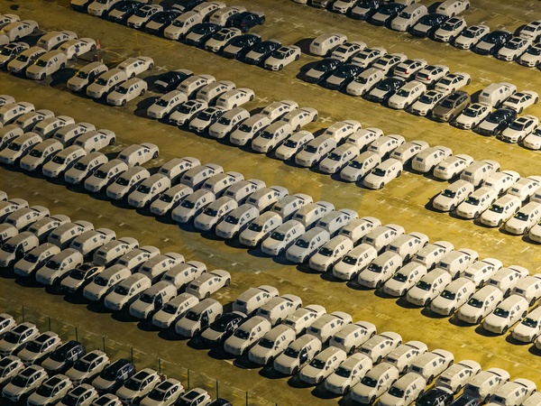 Aerial view of new cars waiting for shipment to overseas markets in a port in Nanjing in east China's Jiangsu province Sunday, Sept. 07, 2025., Credit:stringer / Avalon