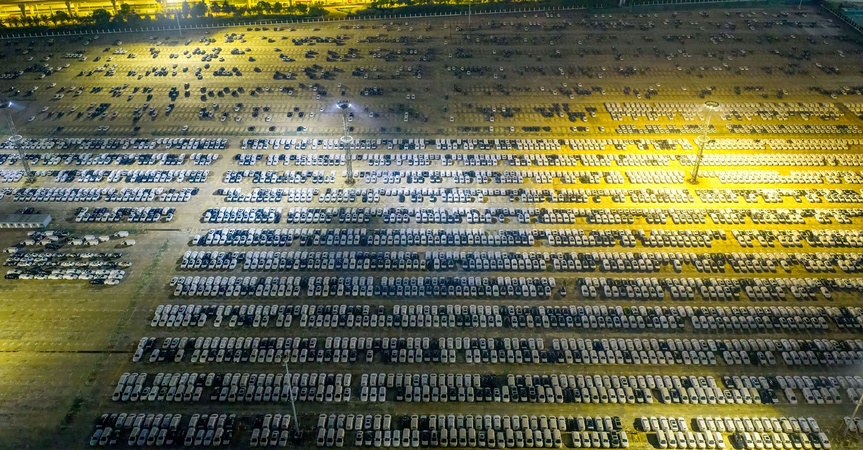 Aerial view of new cars waiting for shipment to overseas markets in a port in Nanjing in east China's Jiangsu province Sunday, Sept. 07, 2025., Credit:stringer / Avalon