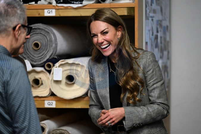 Britain's Catherine, Princess of Wales smiles during a visit to Marina Mill in Cuxton, south east England on September 11, 2025. Marina Mill was established in 1967, and is based in an old Victorian mill on the banks of the River Medway, where a small team produces fabrics using the traditional silk-screen method., Credit:CHRIS J RATCLIFFE / Avalon