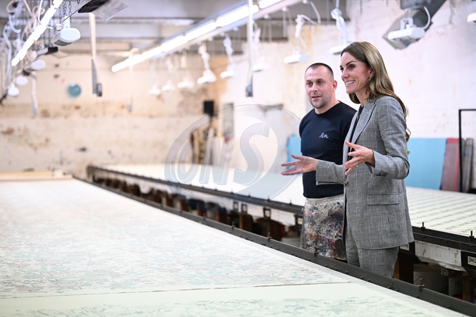 Britain's Catherine, Princess of Wales looks at a screen print during a visit to Marina Mill in Cuxton, south east England on September 11, 2025. Marina Mill was established in 1967, and is based in an old Victorian mill on the banks of the River Medway, where a small team produces fabrics using the traditional silk-screen method., Credit:CHRIS J RATCLIFFE / Avalon