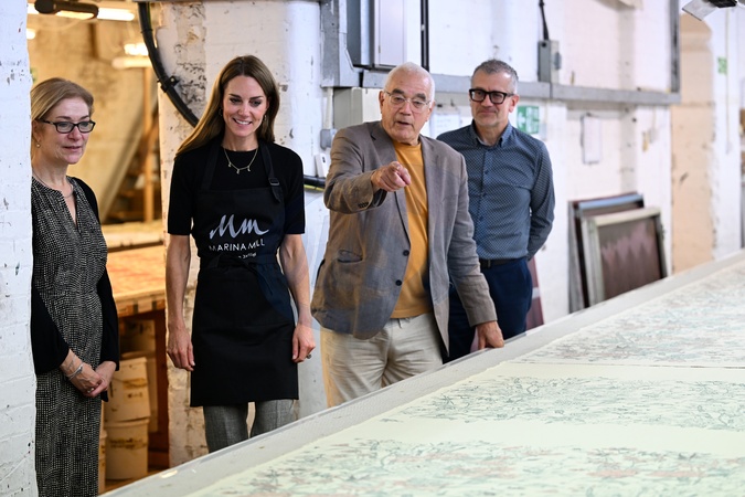 Britain's Catherine, Princess of Wales looks at a screen print during a visit to Marina Mill in Cuxton, south east England on September 11, 2025. Marina Mill was established in 1967, and is based in an old Victorian mill on the banks of the River Medway, where a small team produces fabrics using the traditional silk-screen method., Credit:CHRIS J RATCLIFFE / Avalon