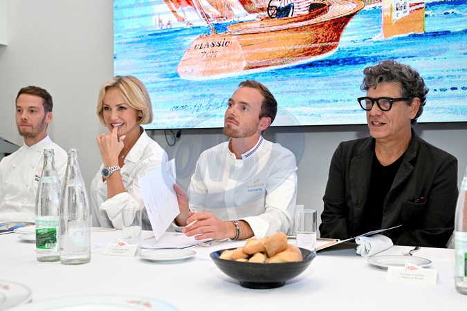 Sébastien Tantôt, le chef du Maybourne Riviera, Adriana Karembeu, Tom Meyer, le chef de laChèvre d'Or et Marc Lavoine - Adriana Karembeu, le mannequin, actrice et animatrice de télévision slovaque, accompagnée par Marc Lavoine, est l'invité du Yacht Club de Monaco pour la Monaco Classic Week à Monaco, le 11 septembre 2025. Bernard d'Alessandri, le secrétaire et directeur général du Yacht Club de Monaco, a fait découvrir à Adriana différentes unités comme Le Créole, 1926, qui appartient à Allegra Gucci, l'arrière-petite-fille de Guccio Gucci, fondateur de la célèbre maison italienne. Adriana a ensuite embarquée à bord du Wiki, pour la régate, puis a participé au jury du Concours des Chefs présidé par Tom Meyer, Meilleur Ouvrier de France et Chef exécutif de la Chèvre d'Or à Eze. Pour Marc Lavoine, c'est une première, participer à une telle compétition a été la découverte d'un nouvel unvivers sportif. En 1994, pour fêter les 10 ans de présidence du Prince Héréditaire Albert et le 90ᵉ anniversaire des premiers meetings internationaux de canots automobiles de 1904, le Yacht Club de Monaco organise une manifestation inédite dédiée au yachting classique, alors en plein renouveau. Le succès de cet événement, réunissant canots automobiles anciens, motor-yachts d'époque et voiliers de tradition, est tel qu'il conduit à son renouvellement en 1996 puis en 1997 pour célébrer les 700 ans de la Principauté. Depuis, cette biennale continue à accueillir sur invitation les plus belles unités du yachting de tradition et du motonautisme d'époque, avec à leur bord des armateurs passionnés. © Bruno Bebert / Bestimage Adriana Karembeu and her partner Marc Lavoine are in Monaco for Monaco Classic Week, organised by the Yacht Club on september 11th 2025