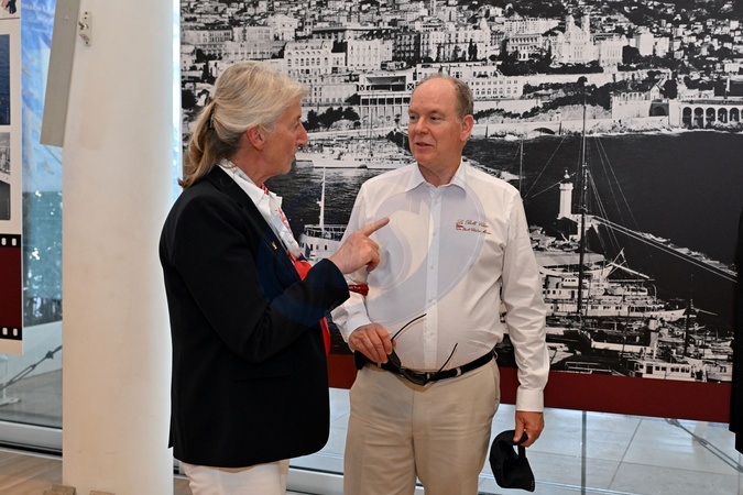 Le prince Albert II de Monaco a fait un passage au Yacht Club de Monaco dans le cadre de la Monaco Classic Week, en compagne de la navigatrice Catherine Chabaud et guidé par Bernard d'Alessandri, le secrétaire et directeur général du Yacht Club de Monaco, le 11 septembre 2025. Ils ont déambulaient sur le quai où les navires d'époques, à voiles et à moteurs sont amarrés. Ils ont ensuite découvert une exposition photographique sur les bateaux et le cinéma avec un clin d'oeil à la princesse Grace et une ilage sortie d'une comédie musicale hollywodienne de 1956, High Society. © Bruno Bebert / Bestimage Prince Albert II of Monaco visited the Monaco Yacht Club as part of Monaco Classic Week, accompanied by sailor Catherine Chabaud and guided by Bernard d'Alessandri, secretary and general manager of the Monaco Yacht Club, on September 11, 2025. They strolled along the quay where vintage sailing and motor boats are moored. They then discovered a photographic exhibition on boats and cinema with a nod to Princess Grace and a scene from the 1956 Hollywood musical High Society.